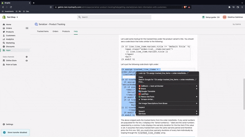 Open the "Shipping confirmation" email notification in Shopify admin settings (Settings > Notifications > Shipping confirmation). In there, you should see the markup for the email body. Let's add some markup to display serial numbers and warranty information under each tracked line item.