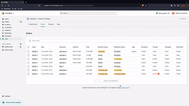 Sometimes you may notice a warning on the app's "Orders" or "Serialize items" pages indicating that the order contains more tracked than total items. The issue may be caused by item(s) being removed, e.g. via Shopify's "Edit order" or "Return items" pages or other apps.